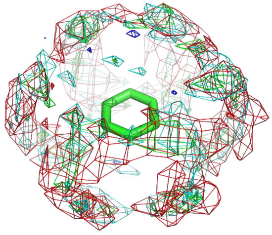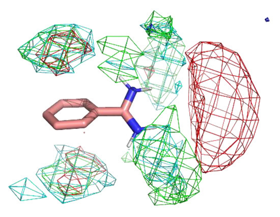 The residue interaction profile of benzamidine. Green, cyan, gray, blue, and red meshes indicate profiles of hydrophobic, hydrophilic, aromatic, basic, and acidic residues, respectively. The molecule structure is that of benzamidine.