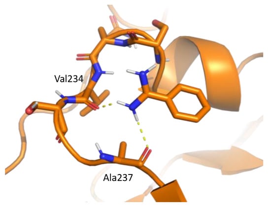 Figure 4 shows the residue interaction profile of benzamidine. Benzamidine has a basic group and the residue interaction profile correctly and clearly depicted the position of acidic residues. Furthermore, profiles of multiple types of residues were detected among the amidino group, indicating hydrogen bonds between the main chains and the amidino group (Figure 5). For the phenyl group, profiles of acidic, hydrophilic, and hydrophobic residues were detected in the vertical direction of the phenyl group. This suggests that the protocol captured amide- stacking [46]. Therefore, these profiles can provide a physicochemical account of general non-covalent interactions, and the results demonstrate the validity of the proposed method.