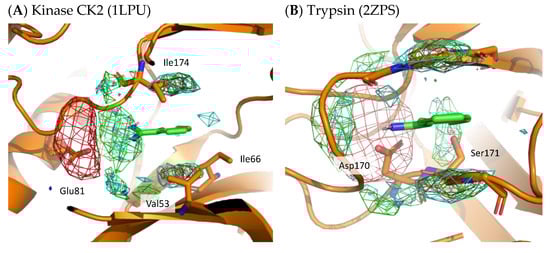 X-ray structure with residue interaction profile of benzamidine obtained from MSMD simulation. (A) Kinase CK2 with benzamidine (PDBID: 1LPU); (B) trypsin with benzamidine (PDBID: 2ZPS). Green, cyan, gray, blue, and red meshes indicate profiles of hydrophobic, hydrophilic, aromatic, basic, and acidic residues, respectively.