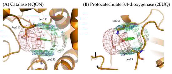 X-ray structures with the residue interaction profile of catechol obtained from MSMD simulation. (A) Catalase with catechol (PDBID: 4QON); (B) protocatechuate 3,4-dioxygenase with catechol (PDBID: 2BUQ). Green, cyan, gray, blue, and red meshes indicate profiles of hydrophobic, hydrophilic, aromatic, basic, and acidic residues, respectively.