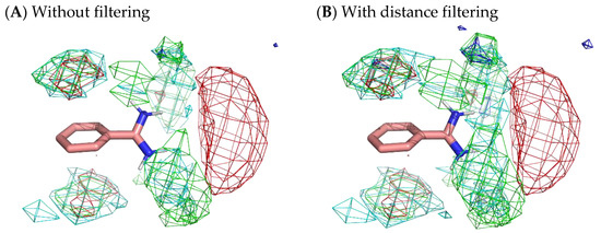 Comparison of residue interaction profiles of benzamidine obtained from MSMD simulation with and without consideration of moving distance of probe molecules. (A) Without the selection of stable probe molecules (note that it is the same figure as Figure 4); (B) with the selection of stable probe molecules. Green, cyan, gray, blue, and red meshes indicate profiles of hydrophobic, hydrophilic, aromatic, basic, and acidic residues, respectively.