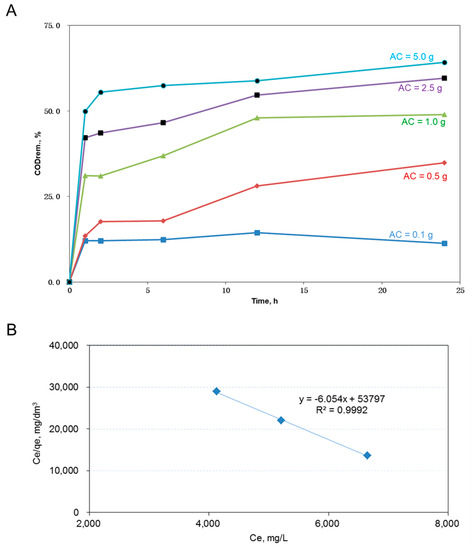 Adsorption characteristics of the used AC. (A) Plots of the percent COD removed versus the AC amount used in adsorbing the dyeing wastewater COD. (B) Plot of the Ce/qe ratio versus Ce. The maximum adsorption capacity (qmax) at 24 h in (A) was equal to 0.165 (calculated by 1/6.054) g-COD/g-AC.