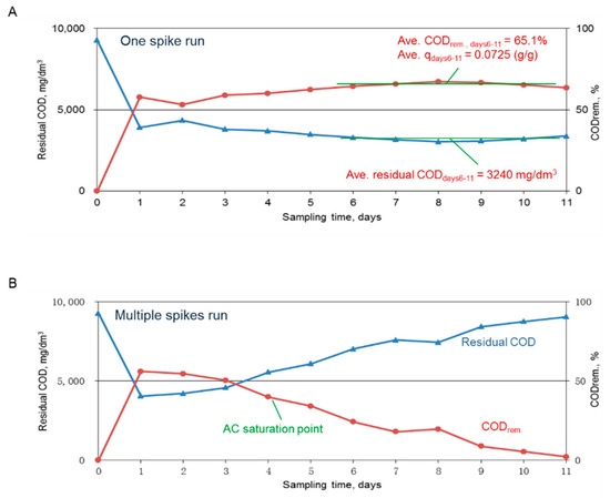 The results for the residual COD and the removed COD after using of 5 g of AC to adsorb one spike or multiple spikes of the dyeing wastewater are shown in Figure 2A,B, respectively. Figure 2A reveals that the residual COD for one spike of 60 mL dyeing wastewater leveled off at 3240 mg COD/dm3, which was consistent with previous data. The results also revealed that the adsorption reaction was completed within a day. In the contrast run, the same amount of dyeing wastewater was used to replace the treated wastewater daily, and the results revealed that the AC adsorption capacity declined over time and was nearly exhausted by the 11th day. These results indicated that without regeneration the AC could absorb ~65% COD of the tested wastewater; however, via a daily operation, the COD removal rate was maintained at higher than 50% by day 3. Since a 50% or higher COD removal rate was targeted, saturated AC needed to be wasted on day 3 if not being regenerated.