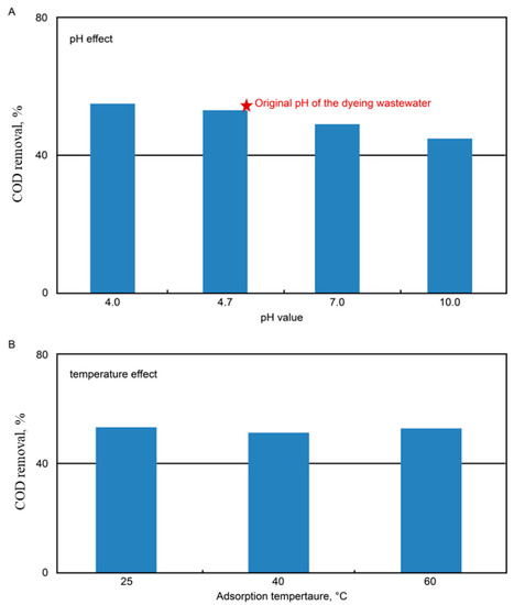 Effects of pH at ambient temperature (A) and temperature at pH = 4.7 (B) during AC adsorption runs. A lower pH value showed a greater percent COD removal, but the temperature had little effect.