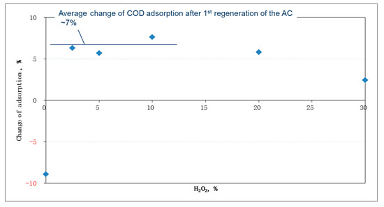 The factor analysis during adsorption operations showed that there were adverse effects on COD removal as pH increased over the range of 4–10 (see Figure 3A), which might be caused by the reduced dissociation of dye molecules at acidic conditions. Similar results were concluded by Al-Degs et al. [26]. On the other hand, the temperature effect on adsorption was minimal at 25–60 °C (see Figure 3B). Although individual dye adsorption could be either exothermic or endothermic [26], the use of real wastewater might contain both types of dyes, which leveled off the temperature effect. Practically speaking, the collected data suggested that there was no need to control either pH (since the original pH remained low at 4.7) or temperature during the adsorption stage. The results shown in Figure 4 demonstrated that adsorption capacity increased after treatment by oxidative regeneration. In comparison with the virgin AC, the regenerated AC displayed an increase in adsorption capacity by about 7% on average, if the peroxide dose was less than 10%. On the other hand, the adsorption capacity dropped by nearly 10% in the non-regenerated case (i.e., an initial peroxide content of 0%). Moreover, an increase of the peroxide dose appeared to lower the adsorption percentage of the regenerated AC, especially in the case of a peroxide dose of 30%, which might result from the destruction of the AC pore structure. Thus, a peroxide dose of 2.5% was considered sufficient in regenerating the saturated AC.