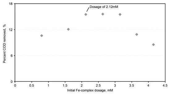 Plots of the percent COD removed after its regeneration at various initial Fe-complex dosages and a peroxide concentration of 2.5%. The use of an initial Fe complex at 2.12 mM had the highest percent COD removal value. A higher Fe complex could consume the oxidative capacity of the peroxide and resulted in the drop of the percent COD removal.