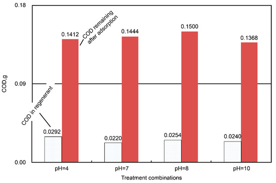 Plots of the COD residues (by weight) in the regenerant and the amounts of the remaining COD in the AC-treated wastewater under various regenerative pH conditions at ambient temperature. The variation of the pH showed little effect on the AC regeneration.