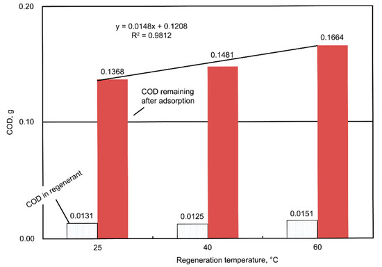 Plots of the COD residues (by weight) in the regenerant and the amounts of remaining COD in the AC-treated wastewater under various regenerating temperatures and a fixed pH value of 4.7. The lower the regeneration temperature, the less COD remained after adsorption.