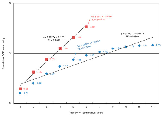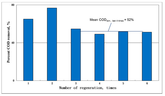 The results of the consecutive adsorption–oxidation operation showed that more than 50% of the COD was consistently achieved with a 52% removal of the last four adsorption runs (Figure 8). By comparison with the cumulative COD adsorption between the regeneration and non-regeneration runs (11 cycles), we found that 5 g of regenerated AC could adsorb 0.3625 g-COD per cycle in the regeneration cases (Figure 9). On average, the adsorption capacity (q) value of the unit AC in each adsorption step was equal to 0.0725 g-COD/g-AC. Based on the previous material balance results, the adsorbed COD was presumably oxidized, so that the pore vacancy could be used again to uptake the COD during the next cycle.