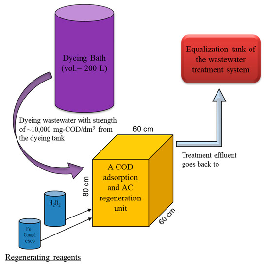 Based on the obtained data and the current yarn dyeing process, the treatment of the high COD dyeing wastewater from a commonly used a 200 L dyeing bath using the proposed two-step treatment system looks applicable and was proposed with dimensions, as shown in Figure 10. To our knowledge, there is no such kind of the proposed setup in current operating dyeing facilities. The designed volume (i.e., 200 L) is sufficient to contain a batch effluent from the dyeing tank, so that the high COD wastewater can go directly to adsorption and regeneration in the proposed unit. Based on the results, a 50–60% removal of the COD would greatly minimize the COD flowing back to the equalization tank, so that the overloading scenarios of the existing in-plant biological treatment units could be avoided. To operate the proposed unit, first, a certain amount of the high COD wastewater from the dyeing tank is to be directed to a reactive unit filled with designated AC (20 kg if 120 L of wastewater are treated) for 24 h adsorption. Since the results suggested that the dyeing bath effluent COD was adsorbed more at acidic pH, regardless of temperature variation, neither pH nor temperature needs to be adjusted at this stage.