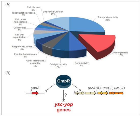 Label-free quantitative mass spectrometry of in-solution trypsin digestion products (shotgun procedure) was applied for the proteomic analysis of the outer membrane-enriched sarkosyl-insoluble fractions (OMsl fraction) of Y. enterocolitica wild-type strain Ye9 (bioserotype 2/O:9) and the ompR deletion mutant of this strain (AR4), cultured in LB medium (standard conditions); LB supplemented with NaCl (386 mM), or in LB at pH 5.5, at both 26 °C and 37 °C [65]. The ompR mutant (ΔompR::Km) AR4 was constructed by a reverse genetics PCR-based strategy [59]. The procedure used for the isolation of OMsl was designed to obtain the highest number of proteins in a highly reproducible manner from multiple biological samples handled in parallel. This analysis revealed over one hundred membrane proteins or proteins functionally connected with the OM fraction that are involved in various biological processes and are affected by OmpR. Proteins belonging to the “Pathogenesis” Gene Ontology (GO) category accounted for 17% of the OmpR-regulated targets (Figure 1). The list of proteins involved in pathogenesis and differentially regulated by OmpR under the applied environmental conditions, was dominated by pYV-encoded components of the Ysc-Yop T3SS. These proteins were more abundant in the outer membrane-enriched fractions of the ompR mutant than in those of wild-type Ye9N cells grown at 37 °C under all tested environmental conditions. Another protein that was more abundant at 37 °C in the ompR mutant was the pYV-encoded adhesin YadA, and we have characterized the influence of OmpR on yadA gene expression at the transcriptional, post-transcriptional and protein levels [65]. Moreover, on the list of OmpR-regulated proteins were structural components of urease (UreA and UreC, and accessory protein UreG), an important enzyme for enteric pathogens, including Yersinia, that promotes persistence in environmental niches of low pH. Our recent study showed that the urease genes in Y. enterocolitica Ye9 are organized in three ure transcriptional units (ureABC, ureEF and ureGD), and that OmpR has a positive impact on their expression at 37 °C [66]. Urease genes are also directly and positively regulated by OmpR in Y. pseudotuberculosis [54].