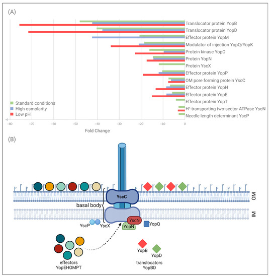 Proteins of the Y. enterocolitica Ysc-Yop T3SS whose abundance differs significantly between wild-type strain Ye9 and ompR mutant AR4. (A) The chart shows the AR4:Ye9 protein abundance ratios under different growth conditions. Green indicates standard conditions (LB medium); blue indicates high osmolarity (LB supplemented with NaCl to 386 mM) and red indicates low pH (LB adjusted to pH 5.0), with incubation at 37 °C. (B) Diagram of the Y. enterocolitica cell wall showing the Ysc secretory apparatus and its substrates before target cell contact, according to the two-step model of secretion. The proteins displaying increased abundance in the ompR mutant compared with the wild-type strain when grown in LB medium at 37 °C are marked. Protein YscC forms a ring in the bacterial outer membrane (the OM ring) and creates the basal body of the secretory apparatus. YscN, located on the cytosolic face of the basal body, is the ATPase driving the secretion of substrates. YscP and YscX are categorized as early secretion substrates: YscP participates in needle assembly and as a substrate specificity switch, YscX is required for the export of early substrates. YopN acts to block Yops export. YopQ may interact with YopD to influence the function of the injectosome. YopB and YopD are translocators. YopEHOMPT is the effector Yops. Created with BioRender.com (accessed on 24 February 2022).
