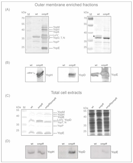 To further analyse the role of OmpR in the regulation of the Ysc-Yop T3SS, we examined the abundance of Yop proteins in total cell extracts of strains differing in OmpR content, grown in LB at 37 °C: wild-type Ye9, ompR mutant AR4, and AR4 carrying the ompR allele in trans on plasmid pompR [65]. Surprisingly, Western blot analyses of these samples with anti-Yops antiserum did not show the striking differences in the level of Yops between the wild-type strain and the ompR mutant seen in OMsl samples (Figure 3C). Interestingly, only the band at the position corresponding to YopD and/or LcrV was clearly stronger in the total cell extracts of the ompR strain. Complementation of the ompR deletion mutant AR4 with pompR restored the level of the Yops to that observed in wild-type strain Ye9. Since YopD, together with the other translocatory protein YopB, showed the highest abundance of all Ysc-Yop T3SS proteins in OMsl samples of the ompR strain according to the proteomic data, i.e., a 40-fold increase for YopD in LB medium (Table 1), the strong immunoreactive band in the ompR mutant cell extract was assumed to be YopD. This was confirmed by the result of the Western blot with a polyclonal anti-YopD antibody. In comparison, the bands reacting with antibodies specific to YopH and YopE were of similar intensities in the wild-type and mutant cell extracts (YopH) or only slightly increased by the absence of OmpR (YopE) (Figure 3D).