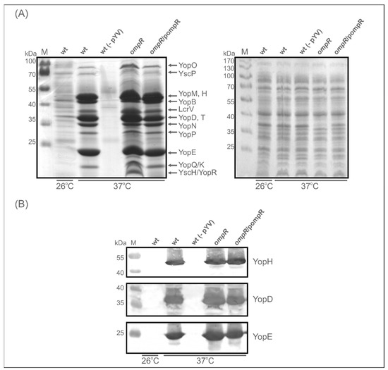 Proteomic analysis of the OMsl fraction showed substantial alterations in the abundance of Yop proteins (translocators and effectors) resulting from the loss of regulator OmpR. To confirm this observation, we used an antiserum directed against Yop proteins to perform a Western blot analysis of the OMsl samples used for the MS studies (Figure 3A). Strong bands of highly abundant Yops were detected in the sample prepared from the ompR mutant AR4 grown in LB at 37 °C. The band intensities were much greater than in the equivalent wild-type Ye9 sample. As a loading control, the Coomassie blue-stained gel of OMsl samples is shown in the right-hand panel of Figure 3A. As expected, an OmpC/OmpF porin band, located at approx. 35 kDa on the stained gel (the porins are not resolved into separate bands under these conditions), is present in the wild-type strain but absent from the ompR mutant sample. OmpR is an activator of ompC/ompF expression in E. coli and Y. enterocolitica, thus this result confirms the phenotype of the ompR deletion mutant [72]. Next, specific antibodies were used for the immunodetection of two effector Yops, i.e., YopH and YopE, and translocator YopD in the OMsl samples. This analysis confirmed the higher levels of these Yop proteins in the ompR mutant background compared with the wild-type when both strains were grown in LB at 37 °C (Figure 3B).
