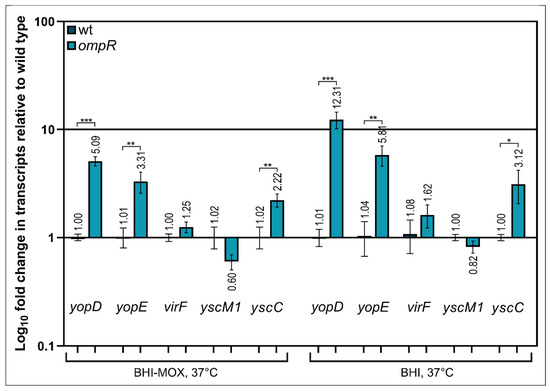 It was previously shown that the VirF protein of Y. enterocolitica (LcrF in Y. pseudotuberculosis) is a master transcriptional activator that directly controls the expression of several T3SS genes/operons by binding to their promoter regions, e.g., yopE, yopH, virC and the operons lcrGVsycD-yopBD [29]. We hypothesized that OmpR may directly or indirectly affect the expression of the transcriptional activator VirF. To test this notion, we measured virF transcript levels by RT-qPCR in the wild-type strain Ye9 and ompR mutant AR4, grown at 37 °C in the presence (BHI) or absence of Ca2+ (BHI-MOX) (Figure 5). However, levels of the virF transcript were not significantly different in the two strains grown in either medium. Next, we investigated the transcriptional response of some ysc-yop genes, i.e., yscC, yopD, yopE and yscM1, in the wild-type and ompR strains (Figure 5). The yscC gene encodes the translocon component of the T3SS (the OM ring of the basal body of the injectosome), yopD and yopE encode secreted substrates of T3SS (translocator and effector proteins, respectively), and yscM1 (lcrQ in Y. pseudotuberculosis) encodes a protein involved in regulating the expression and function of the T3SS (the anti-activator of virF expression in the presence of Ca2+) [73]. RT-qPCR data showed that the yopD mRNA was expressed at a higher level in the ompR mutant than in the wild-type, in both the presence (~12.0-fold) and absence of Ca2+ (~5.0-fold). Similarly, levels of the yopE transcript were increased in the ompR mutant, by ~5.8-fold (+Ca2+) and ~3.3-fold (−Ca2+), as were the levels of the yscC transcript, by ~3-fold (+Ca2+) and ~2-fold, (−Ca2+). Of the analysed genes, only yscM1 showed no clear change in its transcript level under both applied conditions.