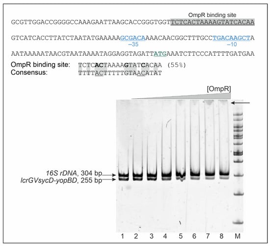 Overproduction and purification of OmpR-His6 and its use in an EMSA to detect interactions of this recombinant protein with DNA sequences were performed as described previously [64]. Briefly, a 255-bp fragment of the promoter region of the lcrGVsycD-yopBD operon and a 304-bp 16S rDNA fragment as a nonspecific competitor were PCR-amplified using Y. enterocolitica genomic DNA as a template and the pairs of primers listed in Table S1. The DNA fragments were incubated in OmpR-binding buffer (50 mM Tris-HCl pH 8.0, 100 mM KCl, 1 mM EDTA, 1 mM DTT, 20 mM MgCl2, 12% glycerol, 100 µg/mL BSA, 0.1% Triton X-100) with increasing amounts of OmpR-His6 (molar ratio of 1:20–300) at 26 °C for 30 min. The samples were then loaded on a 4.2% native polyacrylamide gel (19:1 acrylamide/bisacrylamide, 0.2 × TBE) containing 2% glycerol and electrophoresis performed at 110 V for approximately 3 h. The gel was then stained in 1 × SYBRgreen solution (Invitrogen, Waltham, MA, USA) and visualized using a GE Healthcare AI600 imager (GE Healthcare, Chicago, IL, USA).