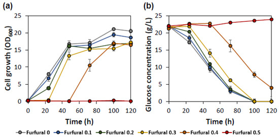 The inhibitory effect of furfural on the cell growth (a) and sugar consumption (b) of Y. lipolytica. Furfural was added to the CSM media at various concentrations of furfural (0–0.5 g/L). Error bars represent the standard deviation of biological triplicates.
