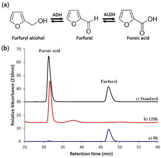 The hypothesized mechanism (a) of furfural detoxification in Y. lipolytica by either ADH or the ALDH converting furfural into furfuryl alcohol or furoic acid, respectively. The HPLC chromatograms (b) of the sample from the control strain expressing empty plasmid at the initial (0 h) and 120 h of incubation under a furfural stress condition.