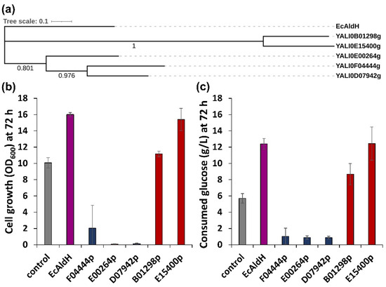 Comparison of the sequence similarities of the endogenous ALDHs, and the effect on the furfural tolerance in Y. lipolytica. (a) Phylogenetic tree of aldehyde dehydrogenases used in this experiment. Cell growth (b) and glucose consumption (c) of Y. lipolytica overexpressing various aldehyde dehydrogenases in the presence of 0.4 g/L furfural.