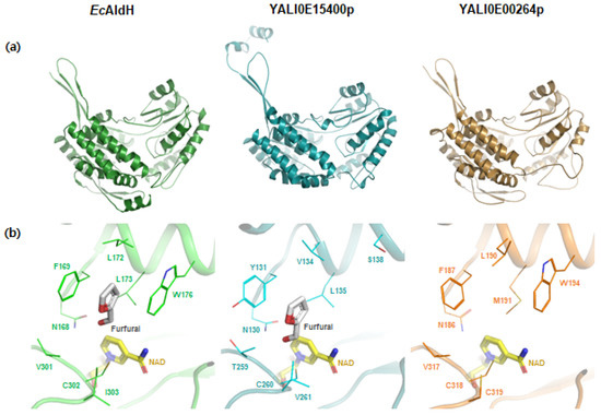 Monomeric structure (a) and docking simulation (b) of EcAldH and endogenous ALDHs. Model structure and docking simulation of EcAldH (left), YALI0E15400p (middle), and YALI0E00264p (right). The core residues forming a substrate-binding pocket are shown as a line model and labeled appropriately. The furfural and NAD ligands are shown as stick models with grey and yellow colors, respectively.