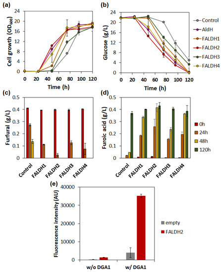 Effect of FALDH overexpression on the cell growth and lipid production of Y. lipolytica in the presence of 0.4 g/L furfural. Cell growth (a), glucose consumption (b), and the conversion of furfural (c) into furoic acid (d) of Y. lipolytica expressing various fatty aldehyde dehydrogenases. Lipid production (e) was measured by using a (Nile-red assay in the Y. lipolytica expressing FALDH2 and FALDH2/DGA1 at 96 h of incubation. Error bars represent the standard deviation of biological triplicates.