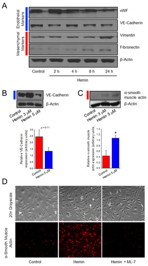 Endothelial to mesenchymal transition (EndoMT) has been implicated as a mechanism for the endothelial dysfunction that leads to vascular remodeling seen in PAH [29]. This phenomenon occurs when endothelial cells lose their endothelial characteristics and begin to develop a mesenchymal phenotype. Steady state free heme in SCD approximates hemin ranges from negligible to 20 µM with an average of 4 µM, assuming complete conversion to hemin [11]. Early data had suggested that the peak effect of hemin on our endothelial cells occurred at a dose of 5 µM (Supplemental Figure S1). To understand if hemin-treated cells undergo EndoMT, western blot analysis was used to probe for both endothelial and mesenchymal cell markers. As shown in Figure 1A, HPAECs treated with 5 µM hemin exhibited a relative decrease in endothelial cell protein expression over time of von Willebrand factor and the adhesion molecule vascular endothelial (VE) cadherin, when compared to control. Coupled with decreased expression of endothelial markers, hemin-treated cells acquire expression of mesenchymal proteins vimentin and fibronectin which shows a relative increase over time as compared to control conditions. VE-cadherin had large fluctuations in expression in these transitional HPAECs with a non-significant trend in reduced expression at 24 h after 5 µM hemin treatment (Figure 1B, p = 0.11) while the mesenchymal marker α-smooth muscle actin (αSMA) is significantly increased (Figure 1C, p < 0.05). The presence of both endothelial cell and mesenchymal cell markers is consistent with EndoMT and a transitional cell phenotype. To further confirm if hemin promotes EndoMT in HPAECs, immunofluorescence was utilized to examine expression of α-smooth muscle actin in these cells. In Figure 1D, HPAECs treated with hemin demonstrated increased expression of αSMA when compared to control. We also chose to evaluate the use of a myosin light chain kinase (MLCK) inhibitor (ML-7) on hemin-treated HPAEC, as cytoskeletal reorganization is an established feature of EndoMT [30,31]. Pre-treatment with ML-7 (20 μM) prevented the increased αSMA expression that was seen in hemin-treated endothelial cells. Taken together, the decreased endothelial marker expression and increased mesenchymal marker expression is consistent with phenotypic changes of EndoMT.