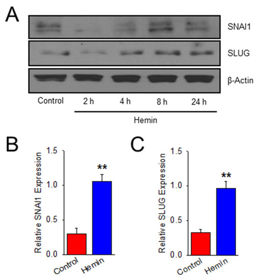 To validate that this upregulation of mesenchymal phenotype with downregulation of endothelial-specific cell markers is mediated by an EndoMT mechanism, hemin-treated cells were probed for expression of established EndoMT transcription factors, zinc finger proteins SNAI1 and SLUG (SNAI2). In Figure 2, SNAI1 and SLUG expression is upregulated in a time-dependent manner in hemin-treated cells when compared to control. Protein expression is significantly increased in hemin-treated HPAEC at 8 h for both SNAI1 (Figure 2B) and SLUG (Figure 2C). This data shows that, in addition to characteristic transitional phenotype changes in hemin-treated HPAEC, EndoMT transcription factors are also upregulated.