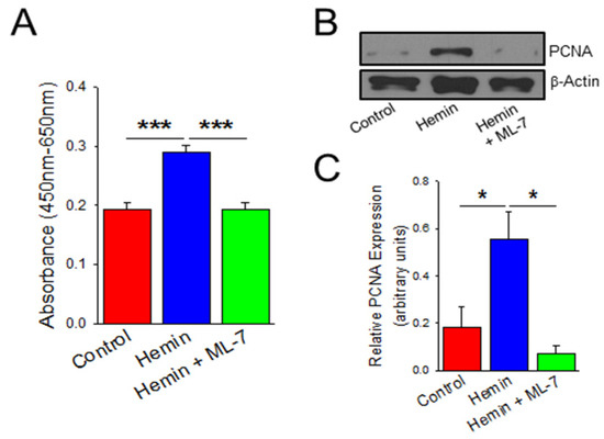 Figure 3. Hemin increases HPAEC proliferation which is prevented by inhibition of myosin light chain kinase (MLCK). (A) Bar graph depicting changes in viability by WST-1 assay in HPAECs treated for 24-h duration with hemin (5 μM), PBS vehicle, and hemin with ML-7 (20 μM) pre-treatment (n = 9). (B) Representative western blot images denoting PCNA protein expression at 24 h measured between HPAECs treated with hemin (5 μM), PBS vehicle, and hemin with ML-7 (20 μM) pre-treatment. (C) Bar graph summarizing relative PCNA protein expression across experiments (n = 6). * indicates p < 0.05; ***, p < 0.001; PCNA, proliferating cell nuclear antigen; ML-7, myosin light chain kinase specific inhibitor.