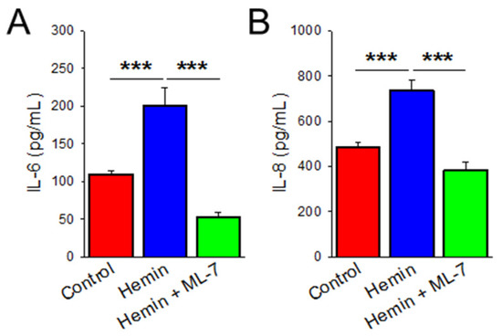 HPAECs were grown to confluence on 6-well plates and treated with 5 μM hemin, PBS, or 5 μM hemin and 20 μM ML-7. After 24 h, the cell culture media was removed and centrifuged, and the supernatant was used for ELISA experiments. IL-6 and IL-8 concentrations were measured using commercially available sandwich ELISA kits according to the manufacturer’s instructions from BioLegend (San Diego, CA, USA). n defined as each independently treated well for a given condition, these independent samples were each run in triplicate. Data presented as mean ± SE.