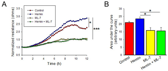 The process of vascular remodeling in the development and progression of PAH is also mediated by increased and disorganized cellular migration [16]. Cellular migration is measured after disrupting the cell monolayer and measuring the recovery and regeneration of the monolayer. Cells were treated with hemin 5 µM and then subsequently subjected to ECIS-based wounding. As shown in Figure 5A, hemin-treated cells demonstrated increased transendothelial resistance (TER) after wounding, indicating a faster recovery when compared to control based on multiple comparison of the continuous data (p < 0.05). The area under the curve measurements for these conditions show a nonsignificant trend toward increased migration (Figure 5B; p = 0.144). Pre-treatment with ML-7 significantly decreased the TER measured by ECIS after analysis of the continuous data (Figure 5A; p < 0.001) and area under the curve (Figure 5B; p < 0.05).