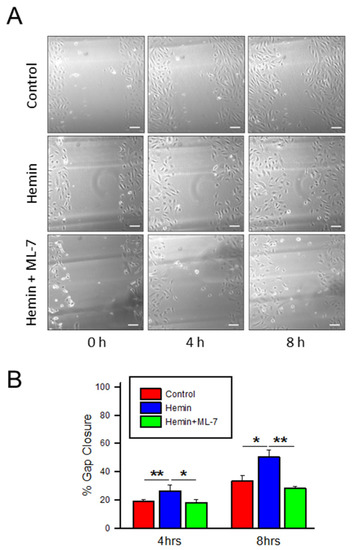 In addition to ECIS analysis, cellular migration was also evaluated by traditional scratch assay to visualize wound closure. In Figure 6A,B, hemin-treated endothelial cells show a trend toward increased migration over the created wound in comparison to control at 4 h (26% versus 19% in hemin-treated and control, respectively, p < 0.01) and 8 h (50% vs. 34%, p < 0.05) time points. ML-7 pre-treatment in hemin-treated cells was also associated with prolonged wound gap closure time in scratch assay at 4 h (26% versus 18%, p < 0.05) and 8 h (50% vs. 28%; p < 0.01) (Figure 6). Together, these data suggest that hemin treatment is associated with a relative increase in endothelial cell migration and that inhibition of MLCK can prevent the increased migration that characterizes endothelial dysfunction in hemin-treated HPAEC.