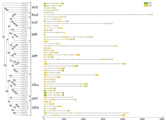Phylogenetic relationship and gene structures of LcAAAPs. Phylogenetic tree of 52 LcAAAPs proteins. Maximum-Likelihood tree was constructed using IQtree. Bootstrap support values from 1000 reiterations are indicated at each node. The 52 LcAAAPs in the tree were divided into eight subfamilies. Gene structure was indicated by green and yellow rectangles, respectively.