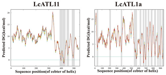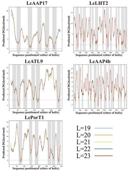 Prediction results of the transmembrane domain of LcATL1a, LcLHT2, LcAPP4b, LcATL11, LcAAP17, LcATL9, and LcPorT1 proteins. The grey area represents the putative transmembrane helix.