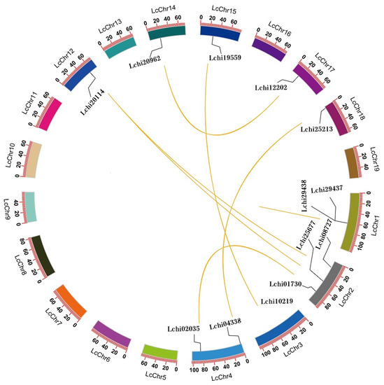 Distribution and segmental duplication of LcAAAP genes in L. chinense. The different colors in the panel show the chromosomes using a circle. Yellow lines connect homologous genes; chromosome numbers are marked outside of the circle.