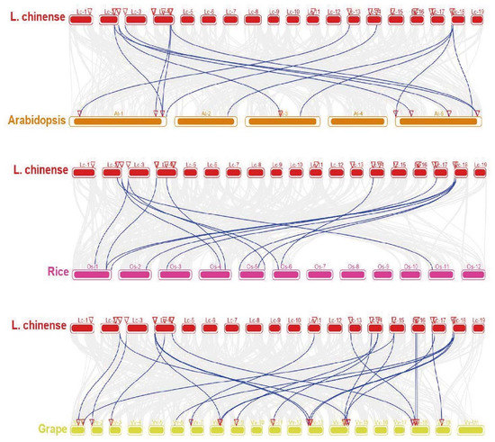 Genome-wide synteny analysis of LcAAAP gene family among L. chinense and three other species. Synteny analysis of LcAAAP genes between L. chinense, Arabidopsis, rice, and grape. Gray lines in the background indicate the collinear blocks between L. chinense, Arabidopsis, rice, and grape genomes, while the blue lines highlight the syntenic AAAP gene pairs. Red open triangles represent homologous genes.