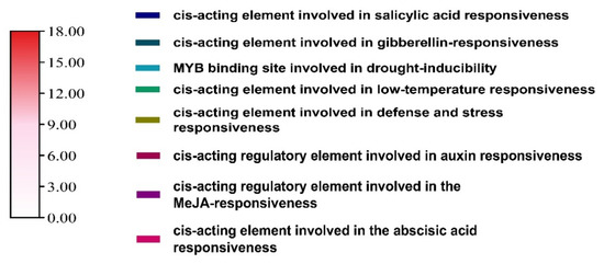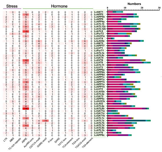 The number of cis-elements in LcAAAP promoters. The motif types of hormones and stress responsiveness are shown in green and purple lines in LcAAAP gene families. Red represents the quantity. The bar chart on the right represents the number of response elements contained in each gene, and different colors represent different types of elements.