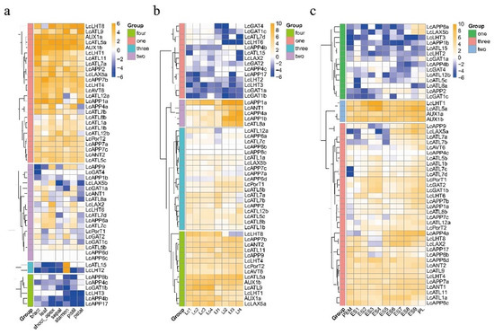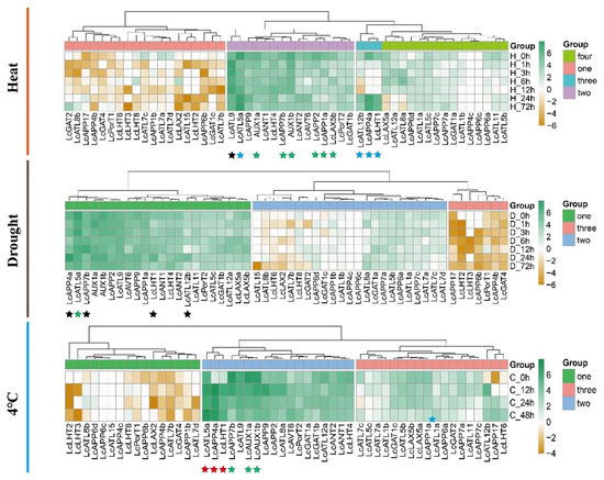 We determined the expression pattern of the LcAAAP gene family under drought, low temperature (4 °C), and heat stress in the leaf (Figure 10). The 52 members were clustered into multiple groups following the different stresses. In response to the heat (40 °C) treatment, four groups were found by gene expression level. The group 3 gene (LcAPP4a, LcLHT1, and LcATL12b) expression levels were downregulated quickly in a short period of time (12 h) and then upregulated. In group 2, the LcATL5a and LcATL9 gene expression levels showed a trend of downregulation and upregulation within 12 h after heat stress treatment, respectively, and then recovered. Downregulated expression levels were detected after 1h of treatment for six genes (AUX1a/1b, LcAPP1a/2/7b, LcLAX5b). In the other genes of groups 1 and 4, the expression levels of most genes in leaves were very low or not expressed. Under drought stress, we did not observe significant up- or downregulation of LcAAAP gene expression except for LcATL5a, which was downregulated as processing time grew. In addition, the expression levels of some members only changed at a certain point, and eventually all returned to the original pattern, such as the LcAPP4a and the LcAAP7b, which upregulated only at 24 h and 12 h, respectively. Regarding the effect of low temperature on gene expression, LcATL5a, LcAPP4a, and LcLHT1 upregulated after 12 h exposure to 4 °C. The LcAPP7b and LcAUX1a/1b showed a trend of downregulated expression. In addition, we found that the LcATL12b expression level increased rapidly in 12 h. In this result, the expression abundances of most genes changed in a short period of time during different stress treatments, but the changes were small. It was worth noting that LcATL5a, LcAPP4a, and LcLHT1 showed different expression patterns under multiple stress treatments. These results suggest that diverse mechanisms control LcAAAP gene responses to various stresses.