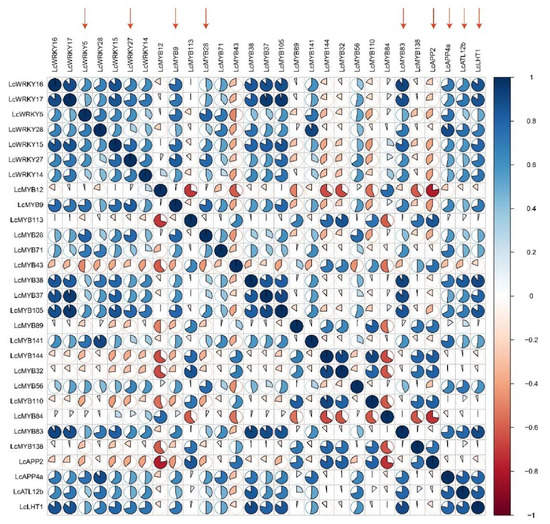 Correlation analysis of LcAAAP/LcWRKY/LcMYB genes under drought, low temperature, and heat stress. The red arrows indicate that these genes were significantly upregulated under the three stressors.