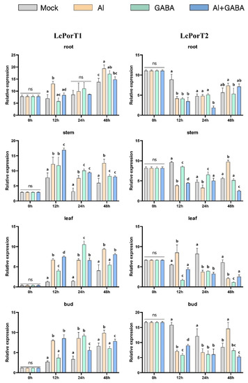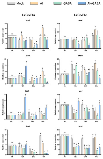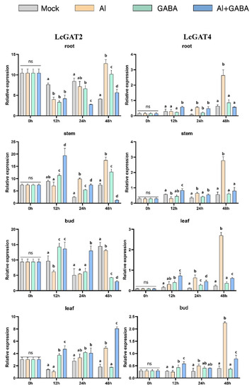 LcGAT1a and LcPorT1 were upregulated in stem and leaf at 12 h after the GABA was applied after the Al stress treatment. A similar situation exists in other GAT genes. For example, expression levels of LcGAT1a, LcGAT1c, and LcGAT2 were upregulated in leaves at 12 h or 48 h; LcGAT2 also was upregulated in stem and bud at 12 h and 24 h, respectively. In addition, the downregulated abundance genes compared with the Al stress in different organs also were detected. LcGAT1a, LcGAT1c, LcGAT2, and LcPorT1 were downregulated in root, stem, and bud after 48 h of treatment. LcPorT2 was downregulated in stem and bud at 48 h.