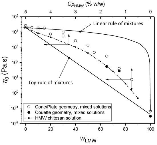 The viscosity () vs. shear rate () i.e., flow diagrams of viscous chitosan solutions containing low and high-molecular weight chitosans display a plateau value at low shear rates corresponding to the Newtonian viscosity, as well as the shear-thinning behavior, typical of chitosan solutions when the shear rate increases [,,,]. The latter behavior relates to the disentanglement of the polymer chains and the evolution of the initial isotropic network towards an oriented macromolecular structure [,]. As a general trend, the addition of low-molecular weight (LMW) chitosan to high-molecular weight (HMW) chitosan, maintaining a constant polymer concentration, significantly decreases the viscosity. Figure 1 shows the evolution of the zero-shear viscosity with the increase of the LMW chitosan content, at a constant chitosan concentration Cp = 5%. In the LMW weight fraction range from 1 to 30%, the collodions remained highly viscous and spinnable, exhibiting viscosities above 104 Pa.s. In our conditions, at pH = 4.5, acid hydrolysis of chitosan chains was shown to have negligible effects by measuring the evolution of viscosity over 2 days []. In the whole composition range however, the substitution of HMW by LMW chitosan induces a significant decrease in the viscosity. This evolution can be framed by the result of two phenomenological mixing rules [], namely the linear and logarithmic mixing rules (Equations (1) and (2)):