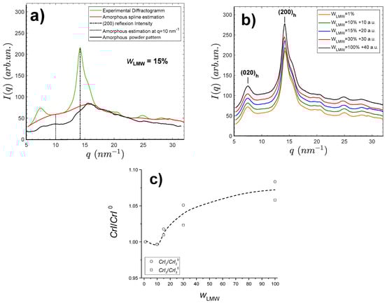 Wide angle synchrotron X-ray scattering patterns of films processed from mixed LMW and HMW chitosan aqueous solutions. (a) Procedures for the calculation of crystallinity index () applied to the LMW chitosan-containing film diffractogram (green), by using the WAXS pattern of an experimentally obtained chitosan amorphous sample (black, ), by estimating the amorphous contribution by a cubic spline calculated from amorphous regions of the diffractogram (red, ), and by simply using the method by Focher et al. [] relation with the intensity of the (200)h reflection and that at q~10 nm−1 (dot line, ). (b) WAXS patterns of films containing different LMW chitosan contents . Curves are shifted for clarity as indicated. (c) Normalized plots for the evolution of crystallinity indexes and with weight fraction of LMW chitosan. The normalization is performed with crystallinity indexes at = 1%.