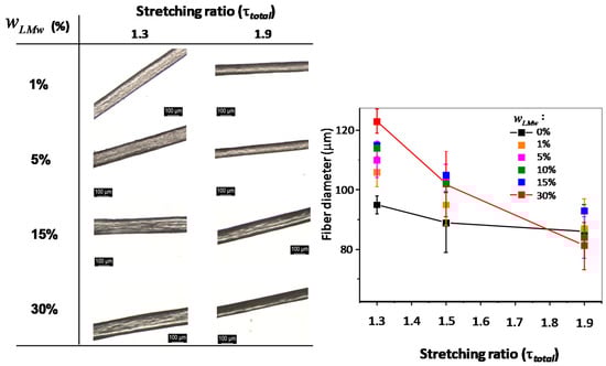 Optical microscopy observations of the fiber surfaces with varied LMW chitosan content and processed under different spinning stretching ratios are shown in Figure 3. There is no apparent effect on the surface or physical appearance in the presence of different proportions of LMW and HMW chitosan. The diameter of the fibers decreases as the stretching ratio is increased, for all LMW content. This result is in agreement with expectations and previous experiments performed on fibers [,]. Nevertheless, as the LMW chitosan content increases, the diameter differences between low and high stretching ratio increases, as seen in Figure 4, whereas it is practically negligible when using a collodion of only high-molecular weight chitosan (). The high-molecular weight chitosan may bring to the extruded solution a more oriented structure that is kept in the neutralized hydrogels. On the contrary, the presence of LMW chitosan may induce a faster relaxation of the orientation at the exit of the spinneret, yielding larger fiber diameters at low stretching ratios. At higher drawing ratios, all fiber diameters are close, as a result of chain orientation. Another possibility could be the leakage of short chains in the coagulation and washing baths, which could be verified by determining the chitosan molar mass distribution in the fibers after the spinning process: short chain leakage would lead to a material loss and consequently thinner fibers. To this end, the molar mass distribution of chitosan in the processed fibers was determined by size exclusion chromatography (SEC).