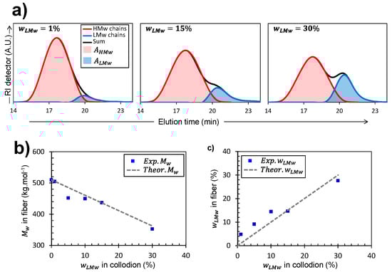 Alternatively, in the case of bi-disperse collodions, it was possible to reconstruct the individual molar mass distribution curves of the two chain populations when the difference in average molar masses was distinctly observed (Figure 4a). Indeed, the elution diagram can be analyzed by considering two Gaussian curves, respectively corresponding to the population distribution of HMW and LMW, as shown in Figure 4a. The areas under the two Gaussian curves can then be used to calculate the experimental weight fraction of LMW chains () present in the spun fibers as follows (Equation (4)):