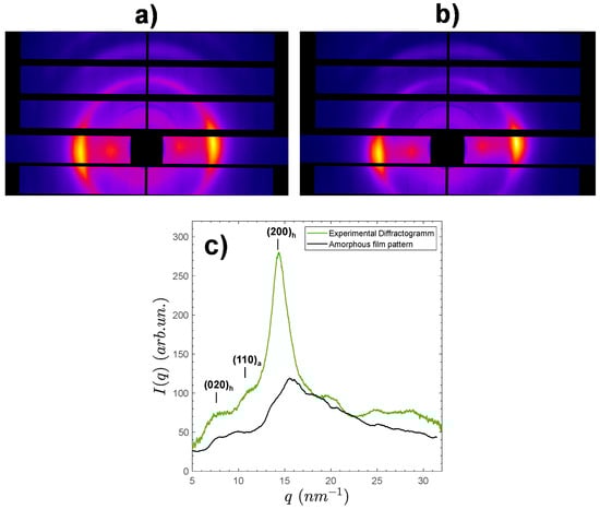 Films made by water evaporation of the aqueous mixtures of the LMW and HMW chitosans and further neutralization with NaOH were analyzed by synchrotron wide angle X-ray scattering (s-WAXS). The results are shown in Figure 2. All film samples exhibit a semicrystalline morphology involving the hydrated allomorph, displaying the (200)h family of planes at and the (020)h planes at about [,]. From these X-ray scattering patterns, crystallinity indexes of the films were calculated according to three different procedures, as shown in Figure 2a. A first crystallinity index was obtained from the Focher et al. [] relation: . A second crystallinity index was deduced from the estimation of the area ratio of the crystalline peaks over the total area of diffractogram: , with the amorphous scattering pattern estimated as a cubic spline using different scattering domains, hypothesized to be mainly due to the contribution of the amorphous phase, i.e., q = 5–5.3 nm−1; q = 9.3–11.2 nm−1; q = 17.3–19.1 nm−1; q = 21.95–23.7 nm−1; q = 26.3–26.85 nm−1; q = 30.2–32 nm−1. At last, estimation was based on the use of the experimental WAXS pattern of an amorphous chitosan sample as reported by Osorio-Madrazo et al. [] (Figure 2a); hypothesizing this amorphous structure of chitosan will be representative of the amorphous phase within semicrystalline chitosan material. Briefly, the diffractogram of the amorphous sample was adjusted by a multiplicative coefficient to the diffractogram obtained for the semicrystalline film sample, in the scattering vector range from to . The calculation was then performed from the area ratio, using the trapeze integration method in the scattering vector range from to . The actual amorphous contribution might result as an intermediate value between those obtained by the cubic spline ) and the experimental amorphous diffractogram ) methodologies.