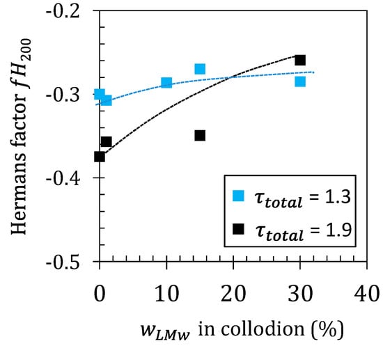 Evolution of the apparent Herman’s orientation factor () with the LMW fraction in the spun fibers, estimated for processing performed at low and high total stretching ratio ().
