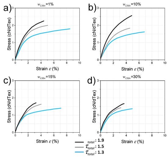Typical nominal stress (in Textile units cN/dTex) vs. nominal strain curves for spun fibers with different LMW chitosan contents , and for stretching ratios = and . (a): = 1%; (b): = 10%; (c): = 15% and (d): = 30%.
