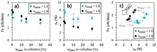 The optimization of the mechanical properties of polymer fibers is generally a subtle task relating several processing and mechanical property parameters such as Young’s modulus, strength/tenacity, and strain-at-break. As a result, the consideration of one mechanical property vs. a unique processing parameter is generally not sufficient to establish if actual behavior achievements could be effectively obtained. As an example of multiple variable discussion, considering the stretching ratio and the composition of the chitosan dopes as processing parameters, the ultimate mechanical properties can be studied as shown in Figure 8a,b. The impact of is shown on the textile tenacity Te and strain-at-break εb. The values obtained are consistent with previously reported values of the tenacity of chitosan fibers []. The textile tenacity increases with stretching ratio. This is consistent with several previous literature data, reporting that improvements in the mechanical properties of the fibers are attainable by applying stretching to the fiber during the wet spinning process [,,]. Tenacity decreases as the LMW chitosan content increases. Fibers with LMW chitosan content have a higher tenacity ), comparable to the pure high-molecular weight (HMW) chitosan fiber, while, when the LMW chitosan content further increases to , the fiber tenacity decreases to . The strain-at-break also decreases with the increase of parameter. Thus, the introduction of LMW chitosan is detrimental to the mechanical properties, for the different stretching ratios investigated here. The rupture plot (i.e., Te vs. εb) is another property correlation to be analyzed as shown in Figure 8c. An improvement of ultimate property parameters would result in a shift in the upper-right quadrant of the rupture envelope draw, as grey arrows joining the rupture points obtained at different stretching ratios. Here again, the introduction of LMW chitosan induces a shift of rupture envelopes to lower Te and εb (Figure 8c), synonymous with a general decrease of the fiber ultimate properties.