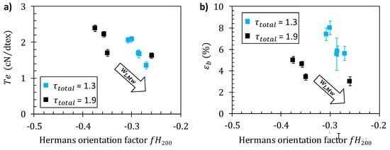 Figure 9a confirms a close relation between fiber tenacity and crystallite orientation as revealed by the apparent Herman’s factor for the (200) planes. The values of tenacity obtained at different stretching ratios and different LMW contents fall on a common pattern. Thus, the fiber material becomes more anisotropic (fH200 decreases towards −0.5) as the stretching rate increases but an opposite trend was observed as parameter increases (see arrow in Figure 9a). Stretching rate increases improve tenacity for a given polymer formulation (Figure 8), but the addition of short chains decreases the mechanical strength, mainly as a result of a decrease in crystalline (and macromolecular) orientation as increases. Such a close relation between tenacity and orientation is in good agreement with recent results concerning the optimization of the wet spinning process of chitosan [].