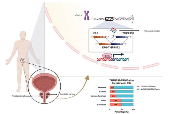 ERG was first discovered in 1987 when a cDNA clone was isolated from a library of colon cancer cells and was labeled as a new member of the E-26 transformation-specific (ETS) oncogene family []. ETS and ETS-related genes have been demonstrated to behave as major regulators of transcriptional activity and are directly involved in proliferation, differentiation, vasculogenesis, and angiogenesis [,]. Bioinformatic analysis has uncovered various fusions in the 5’ untranslated region of TMPRSS2 (21q22) when it is fused to ERG (21q22), ETV1 (7p21), ETV4 (17q21), or ETV5 (3q27), resulting in the overexpression of ETS and ETS-related genes in prostate cancer [,,,]. TMPRSS2-ERG fusion appears in approximately 50% of PCa peripheral zone tumors, while this fusion is only apparent in 12% of PCa transition zone tumors [,]. Additionally, ERG rearrangements seem to occur at variable frequencies depending on the studied population, with Caucasian Americans expressing ERG at a frequency of 50–55%, and African Americans showing an ERG frequency of 28% []. It was also observed that populations of Asian descent had varying ERG frequencies, ranging from 23% in Chinese PCa patients to 49% in Indian PCa patients []. We illustrate the fusion mechanism and its prevalence among different ethnicities in Figure 1.