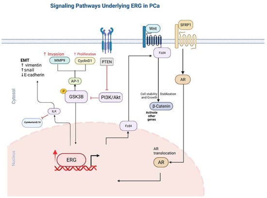 Previous studies have demonstrated that ERG expression results in the upregulation of the Integrin-linked kinase (ILK), which further activates Snail via poly (ADP ribose) polymerase-1 (PARP-1), resulting results in the downregulation of E-cadherin and the activation of the EMT pathway [,]. Furthermore, ILK activation due to ERG activation results in the suppression of cytokeratin 8/18 and increased expression of N-cadherin and vimentin, which further induces EMT pathway activity []. ILK has been shown to be involved in the regulation of the EMT and proliferation pathways (Figure 2), and it has been shown to have increased expression in various cancers [,].